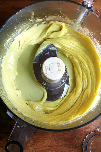 While it's running, add the oil in a slow, steady stream. (Your food processor should have a teeny hole you may never have noticed in the insert -- the "food pusher" -- in the top; if it doesn't, you might want a different food processor.). When an emulsion forms you can add it a little faster. (Again, the little hole makes this unnecessary.) Taste and adjust seasoning if necessary.