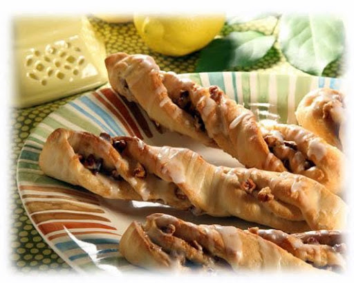 Spray counter lightly with non-stick cooking spray. Roll combined rolls into a 24x9-inch rectangle. Cover with plastic wrap and let rest 10-15 minutes. In a small bowl, combine pecans, brown sugar and lemon peel. Remove wrap from dough and brush middle third with half of the softened butter. Sprinkle buttered area with half of the brown sugar mixture. Fold one of the remaining dough thirds over filling. Brush folded dough with remaining butter. Sprinkle with remaining brown sugar mixture. Fold remaining dough third over filling. Pinch edges to seal. Cut into 8 equal strips (about 1-inch each). Hold each strip at both ends and twist in opposite directions 2 or 3 times. Place on a sprayed baking sheet. Cover with sprayed plastic wrap and let rise 30-45 minutes. Remove wrap and bake at 350°F 10-15 minutes. Combine icing ingredients until smooth. Drizzle over twists.