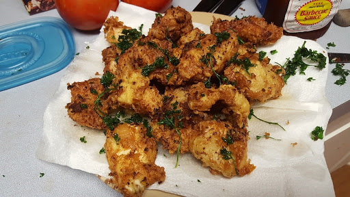 Take your pieces of chicken from the marinade, dip and completely cover them in the batter mixture, then slowly submerge them in the oil with tongs. To keep the oil at a high temperature, and for safety, fry the chicken pieces in batches until the outside is crispy and "mahogany brown." While the last batch is frying, add fresh (but very well dried off) parsley to the oil. Cook the parsley for several minutes until crispy, and crumble over the fried chicken when cooled.