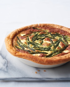Pour custard into crust. Sprinkle with Gruyere and goat cheese and top with asparagus tips. Bake until edges of custard are puffed, top is golden brown, and center is set, about 40 minutes. (Tent with foil if necessary to prevent overbrowning.) Let cool on a wire rack 15 minutes before serving.