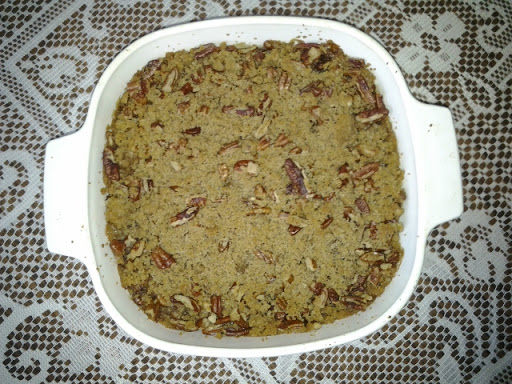 Mix the brown sugar, flour, butter, and chopped pecans until crumbly. Top the sweet potato mixture with this.