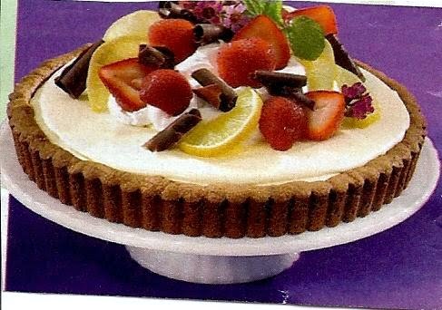 HEAT OVEN TO 350 MICROWAVE CHOCOLATE 30 SEC OR UNTIL MELTED BEAT TOGETHER CHOCOLATE COOKIE DOUGH AND FLOUR PRESS INTO 11 INCH FLUTED TART PAN PLACE PAN ON COOKIE SHEET BAKE 18 MIN USING SPOON PRESS DOWN CRUST COOL COMPLETELY POUR 1/2 CUP WATER INTO SAUCEPAN SPRINKLE GELETIN OVER WATER LET SIT 5 MIN BRING MIXTURE TO A BOIL STIRRING UNTIL GELETIN IS DISSOLVED IN A BOWL COMBINE GELETIN MIXTURE WITH LEMON CURD 2 TBS LEMON JUICE AND 1 TSP LEMON ZEST IN A SPERATE BOWL BEAT CREAM 2 MIN OR UNTIL STIFF PEAKS FORM REMOVE 1 CUP SET ASIDE FOLD REMAINING CREAM INTO LEMON CURD MIXTURE POUR INTO SHELL CHILL FOUR HOURS TOP WITH RESERVED WHIPPED CREAM
