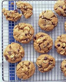 1.Preheat oven to 350 degrees, with racks in upper and lower thirds. In a large bowl, stir together 1 cup creamy peanut butter, 3/4 cup sugar, 1 large egg (lightly beaten), 1/2 teaspoon baking soda, and 1/4 teaspoon salt until well combined. Stir in 3/4 cup semisweet chocolate chips and 1/2 cup roasted salted peanuts.