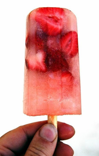 2. In Popsicle molds, drop in 4 to 8 strawberry slices, depending on size.