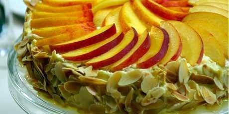 3. Assemble the cake: Set a round of meringue on a serving plate. Spread over a quarter of the buttercream. Lay in a layer of sliced peaches. Spread the top layer with buttercream and set it on top on the first. Spread the remaining butter cream over the sides of the cake. Press the toasted almonds all around the sides. Arrange another layer of peach slices on top.