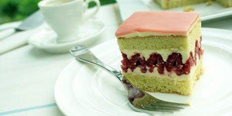 1. Slice the cake horizontally into 2 layers. Place the bottom half on a cake stand. Ice with 1/3 of the buttercream. Cover with raspberries. Ice with 1/3 of the buttercream. Place on the raspberries, icing side down. Ice with the remaining buttercream and top with the almond paste.