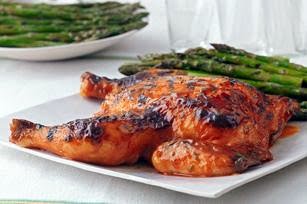 HEAT grill to medium heat. Cover grate with heavy-duty foil; spray with cooking spray. Remove chicken from marinade; discard marinade. Place chicken, breast-side down, on foil. Grill 45 min. or until chicken is done (165ºF), turning after 10 min. Transfer to cutting board. Tent with foil; let stand 10 min. Meanwhile, brush asparagus with reserved dressing mixture. Grill 6 to 8 min. or until crisp-tender, turning occasionally. Slice chicken; serve with asparagus.