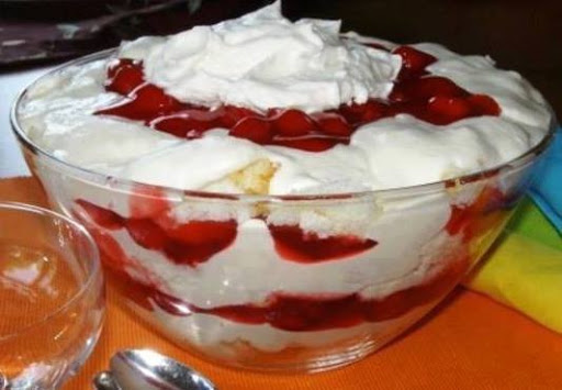 Tear angel food cake into 1 inch pieces.nnPlace 1/3 of cake pieces in bottom of a trifle bowl.