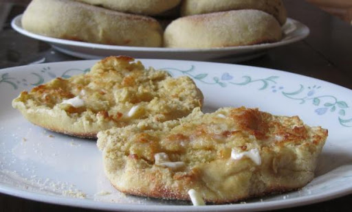 1 Put ingredients in the machine in the order listed. 2 Start the dough cycle. 3 When the cycle is finished. 4 Sprinkle corn meal over your work area. 5 Use your hands to pat the dough into a 1/2 inch thick rectangle. 6 Turn the dough so that each side gets lightly coated with cornmeal. 7 Cut into 8 to 10 rounds. 8 An empty large tuna can works well When you run out of dough gather up the trimmings and cut more rounds. 9 Place the rounds on a baking sheet, cover and let rise for 20- 30 minutes--until not quite double. 10 Heat a dry cast iron skillet or griddle over a low flame. 11 (I do spray mine with Pam). 12 Cook the muffins about 5 to 7 minutes on each side. 13 They should be golden brown when you turn them. 14 Split the muffins with a fork or serrated knife and serve warm. 15 These freeze well and can be reheated in the microwave or toasted.