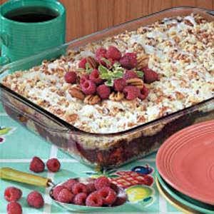 Spread half into a greased 13-in. x 9-in. baking dish. Spread raspberry filling over batter; spoon remaining batter over filling. Combine topping ingredients; sprinkle over top.