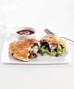 2.Dividing evenly, top half of each round with the sausage, 3 cups grated mozzarella, and 2 cups chopped broccoli; fold over the dough and seal. Place on an oiled baking sheet; brush with olive oil.