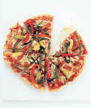 1.Shape 1 pound plain or whole-wheat pizza dough (thawed according to package directions) into a large round; place on a cornmeal-dusted baking sheet.