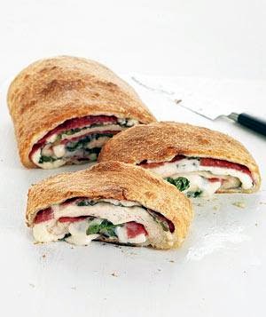 1.Shape 1 pound plain or whole-wheat pizza dough (thawed according to package directions) into a 12-by-15-inch rectangle. Top with ¼ pound sliced salami, 4 cups fresh spinach, and ½ pound thinly sliced provolone.