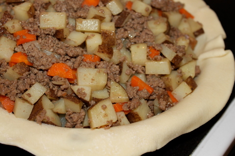 3. Press half the pie crust into a 9 inch pie plate. Pour in the meat mixture.