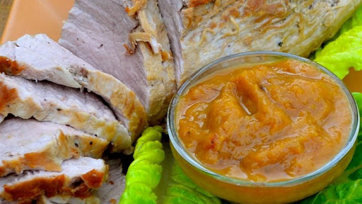 Transfer pork loin to a work surface and let rest, 3 to 5 minutes. Blend pineapple chunks and drippings in a blender until sauce is smooth; serve alongside pork loin.