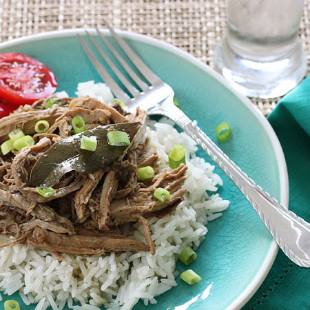 Remove the pork, shred with two forks and put it back in the crock pot for one more hour to let the flavor get into the meat. Discard bay leaves and serve over rice and top with chopped scallions.