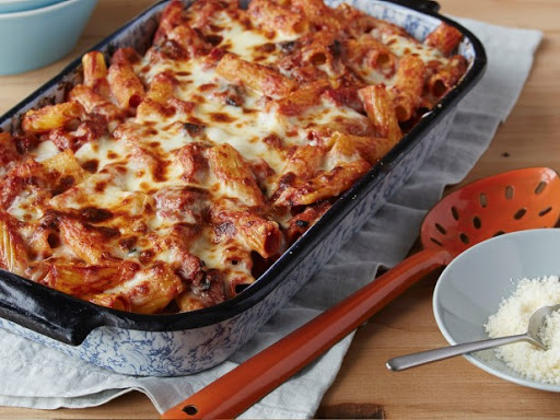 Drain the rigatoni; add the pasta to the saucepan, sprinkle with some Parmigiano and cook for another 30 seconds. Then place 1/2 the rigatoni in a baking dish, adding a layer of 1/2 the mozzarella, 1/2 the scamorza and another sprinkle of Parmigiano cheese over the pasta. Add the remaining rigatoni, and follow with a final layer of all the cheeses. Bake for 20 to 30 minutes or until golden brown.