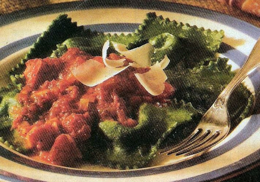 In a large kettle or Dutch oven bring a large amount of water to a rolling boil. Add ravioli, a few at a time, so water does not stop boiling. Reduce heat slightly; continue boiling, uncovered, 6 to 8 minutes or till pasta is al dente (tender but still firm). Drain immediately. Serve with sauce and Parmesan cheese. Makes 4 main-dish servings.