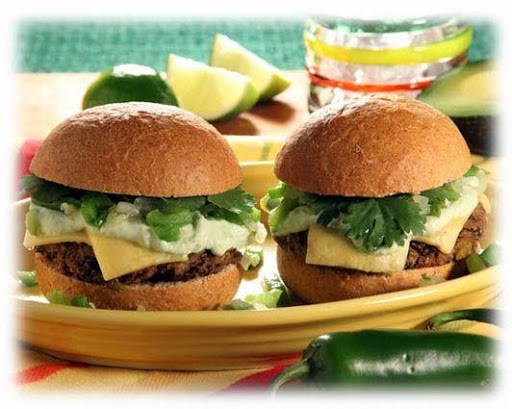 Veggie Patties: Mash black beans, with a fork, in a medium size bowl. Stir in chilies, bread crumbs, paprika, garlic and egg white. Divide mixture into 6 equal portions and form into patties. Season with salt & pepper and cook in olive oil in a skillet over medium-high heat until nicely browned on both sides. Slaw: Saute all ingredients in olive oil over medium-high heat for about 4 minutes or until tender. Sauce: Mix sour cream and mashed avocado in a small bowl until smooth. Add lime juice. Slice baked rolls in half. Lightly toast roll halves in oven. Place patties on toasted buns and top with cheese, slaw, sauce and cilantro.
