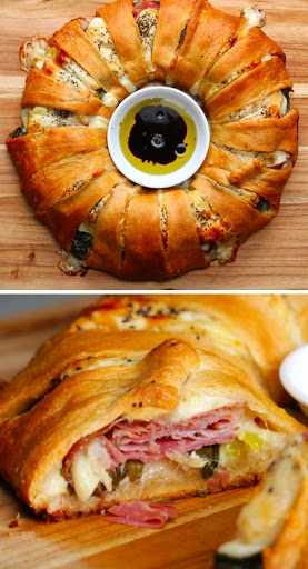 Unroll cans of dough and separate into triangles. On a large cookie sheet, place a bowl in the center (about 5 inches in diameter). Arrange the triangles in a ring around the bowl, dough should overlap.