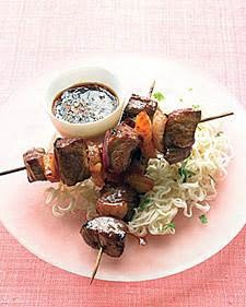 Thread beef, onion, and pineapple onto skewers. Place on prepared baking sheet, and brush with sauce. Broil, brushing occasionally with sauce, until beef is medium-rare and onion begins to char, 7 to 10 minutes.