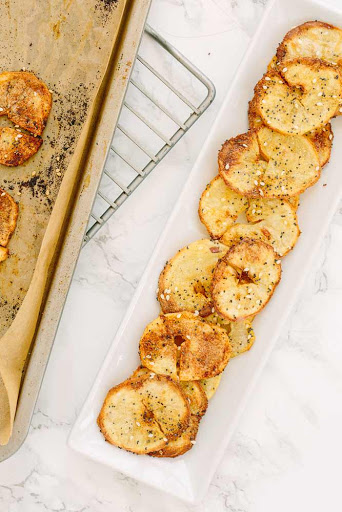 6.Bake in the oven for 15 minutes, flip over, brush with remaining olive oil and season with remaining seasoning. Place the chips back into the oven and cook another 7-10 minutes, checking every 2-3 minutes to make sure the chips don’t burn. If they begin to burn, remove the ones that are burning and place the others back in the oven.