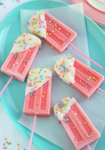 Melt the chocolate or almond bark in the microwave at 30 second intervals. Let cool until barely warm but still pourable. Dip each ice pop in the chocolate and immediately sprinkle with confetti decors.