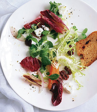 * To serve, drain the juice off the orange into a bowl, whisk in the oil and season with salt and pepper. Arrange the oranges on a serving plate. Toss mine with a bit of arugula and Dan's on top of a leaf of romaine. Stir the olives, feta and herbs into the dressing and divide over the oranges. Sprinkle with freshly ground black pepper and serve.