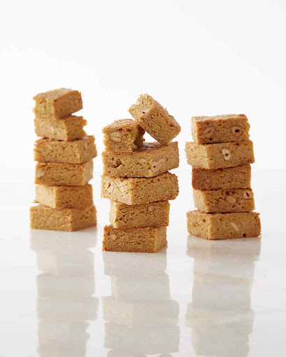 Bake until a cake tester inserted in the center just comes out clean, 35 to 40 minutes (do not over bake). Transfer to a wire rack to cool completely before turning out of pan onto a cutting board. Peel off parchment paper; cut blondies into 3-inch squares.