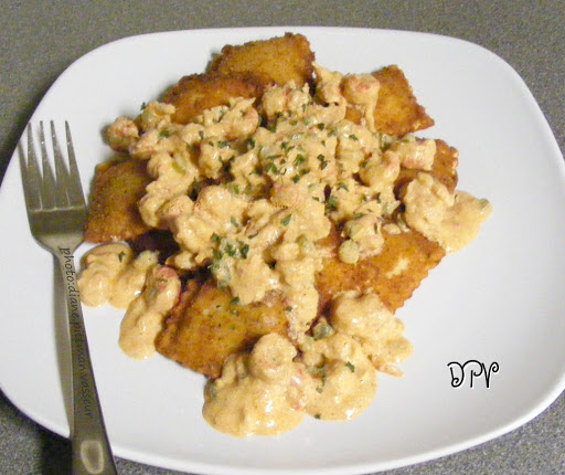 Frozen cheese filled ravioli are deep fried and topped with a creamy crawfish sauce.