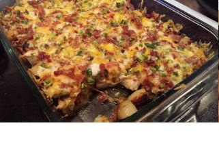 When potatoes are crispy, remove from oven. Lower temperature to 400°F. Top potatoes with raw chicken & cheese mixture. Bake for another 15-20 min. Allow cooling for 10 minutes