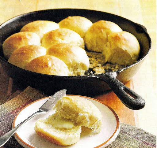 4. Punch down dough. with floured hands, pull off golf ball sized pieces of dough. Shape pieces into balls. Arrange dough balls about 1/4" apart in 2 greased cast iron skillets. Cover skillets with plastic wrap; let dough rise again until rolls are roughly doubled in size, about 1 to 1 1/2 hours. Preheat oven to 350F.