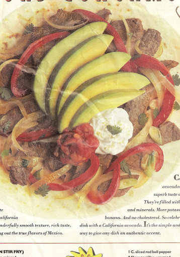 Quickly saute' vegetables in oil until lightly browned; remove from pan. Saute' marinated meat about 4 minutes, toss with vegetables; spoon into flour tortilla. Serve with avocado slices, salsa and sour cream.