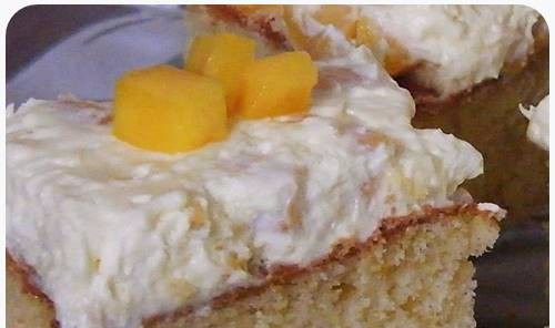 Beat together cake mix, oil, eggs, water and mango puree. Pour into 13x9-inch greased baking pan.