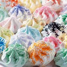 Drop meringue by tablespoonfuls (a tablespoon cookie scoop works well here) onto the prepared baking sheets. Sprinkle each with sparkling sugar crystals. Bake for 1 hour, then turn off the oven and let the kisses cool in the unopened oven (don't peek!) for 2 1/2 to 3 hours (1 1/2 to 2 hours for meringues that are chewy in the center, rather than crisp all the way through).