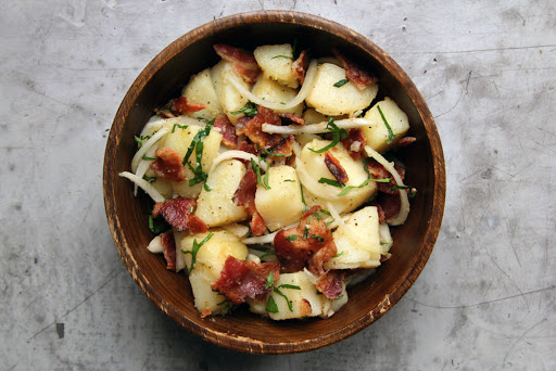 Drain potatoes, peel while still hot, and cut into 1" cubes. Put potatoes into a large warm serving bowl and add bacon and onions. Return skillet with bacon fat to medium-high heat and heat until hot. Carefully add vinegar and salt and pepper to taste. Pour hot dressing over potato mixture and toss well. Adjust seasonings. Garnish with parsley. Serve warm.