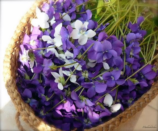 Before serving pour a little syrup on the top of the cake and garnish with violet flowers.