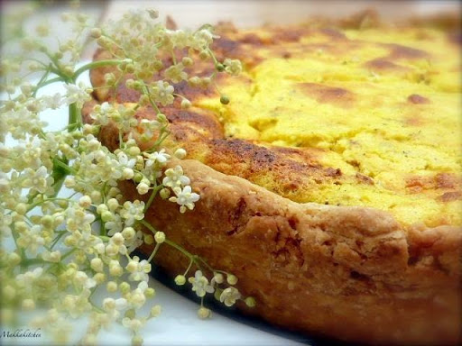 For the filling stir in the quark the sugar, vanilla essence and eggyolks until smooth and creamy. Carefully pinch off the little flowers and stir in the quark. Beat the egg whites with an electric mixer quite hard and combine with the quark. Pour the filling in the pie and bake in the oven for 50 minutes.