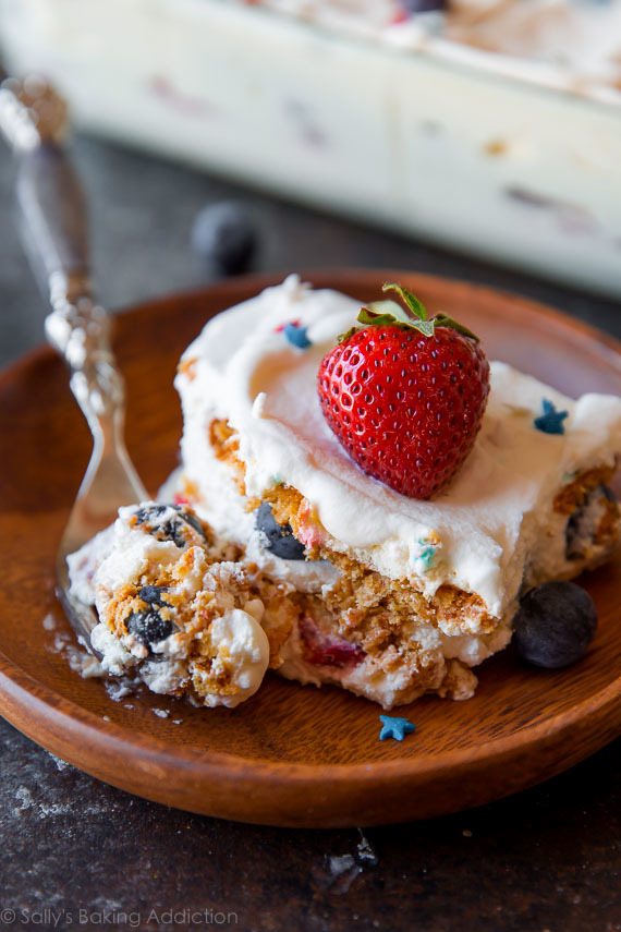 Spread about 2 cups of whipped cream on top of the graham crackers. Then layer the sliced strawberries on top. Follow with another layer of graham crackers, 2 more cups of whipped cream, then the blueberries and another layer of graham crackers. Spread the remaining whipped cream on top and sprinkle with any additional berries and sprinkles.
