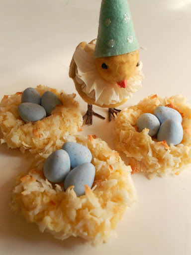 Step 6: Remove from oven. Immediately press three eggs in to the center of each cookie. You may want to lightly press the edges of the cookie inward to give the nest a fuller shape (optional).