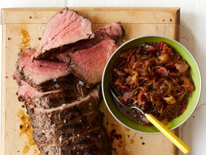 Slice the beef, sprinkle with flaky salt and serve with the bacon-onion jam.