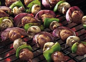 2. Alternately thread meatballs, bell pepper, onion and mushrooms onto four 12 to 14-inch metal skewers.