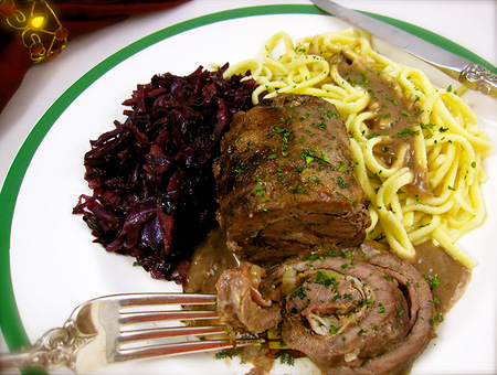 Stir cornstarch and reserved 3 tablespoons beef stock in cup; stir into skillet to thicken pan juices. Bring to low boil; cook, stirring constantly until thick and glossy, about 4 minutes. Season to taste with sea salt and pepper. Ladle gravy over rouladen and garnish with additional chopped parsley. Serve with Spätzle.