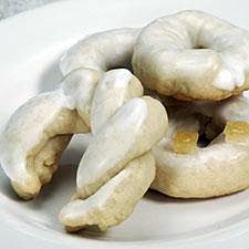 Allow the dough to rest for 5 minutes. Break off the dough in pieces, each about the size of a large walnut. Roll each piece into a rope. From here you may form rings, or simple coils and knots.
