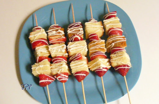 Cubes of vanilla pound cake and chunks of fresh strawberries are threaded on wooden skewers then drizzled with melted white chocolate.
