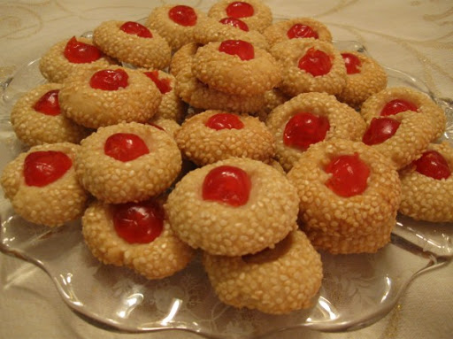 Preheat oven to 400 degrees. Shape dough into 1-inch balls; roll in sesame seeds. Place on ungreased cookie sheet. Press candied cherry half into center of each cookie. Bake for 10 minutes. Let stand on cookie sheet 2 to 3 minutes before removing to wire racks to cool. Makes 3 dozen. Can freeze up to 3 months.