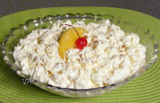 At serving time, garnish top or individual servings if desired with cut pieces of canned pineapple slices and a drained maraschino cherry. (Drain the pineapple and cherries well on paper towels first).