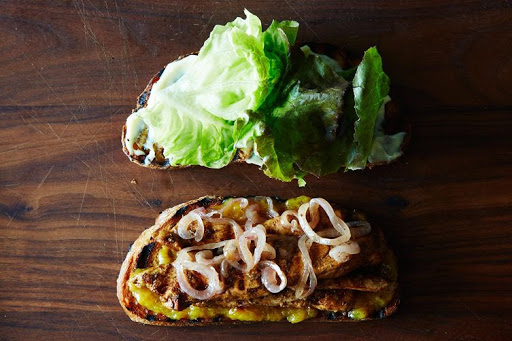 4. Lay out the slices of bread. Spread the jam on one side and the mayonnaise on the other. On top of the jam, add the chicken, onion, then the lettuce. Voilà!