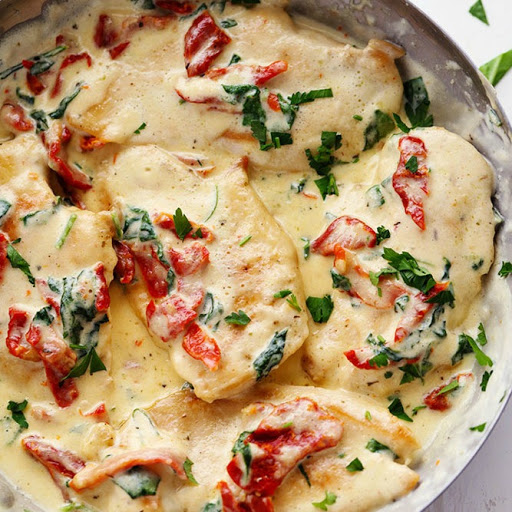 Add the heavy cream, chicken broth, garlic powder, italian seasoning, and parmesan cheese. Whisk over medium high heat until it starts to thicken. Add the spinach and sundried tomatoes and let it simmer until the spinach starts to wilt. Add the chicken back to the pan and serve over pasta if desired.
