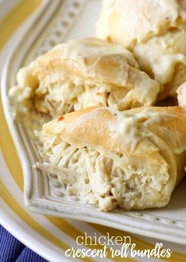 Scoop a spoonful of chicken mix onto the crescent roll dough and roll (we fold the left side in, right side in, and then roll towards the long point)